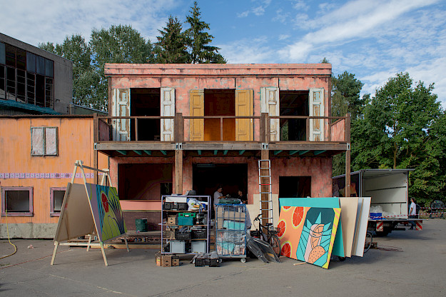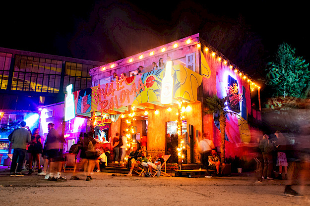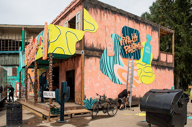 Unsere Lösung: große Platten mit knalligen Patterns der Kampagnen CI am Haus zu montieren. 100% Handarbeit und individuelle Lösungen und Ideen. Und dazu ein Lichtkonzept, das unser House of Paloma zum Shining Star und Hotspot des Festivals gemacht hat.