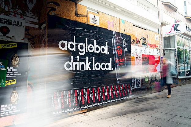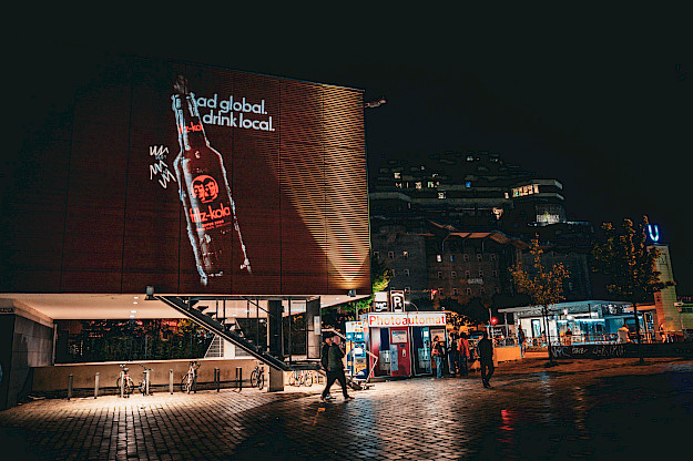 Außerdem haben wir mit Szeneplakatierung, einer interaktiven 18/1 Abreiss-Coupon-Aktion und unserem Buzz Bike Projektionen an prominente Wände im Viertel geworfen und die Botschaft "Act global. Drink local." verbreitet.