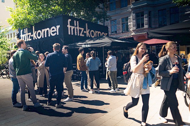 Für Fritz Kola haben wir während des OMR Festivals zum Fritz Korner eingeladen. Dafür haben wir einen unübersehbaren Stand installiert, den anliegenden Kiosk dabei mit eingebunden und seine Wände gestaltet.