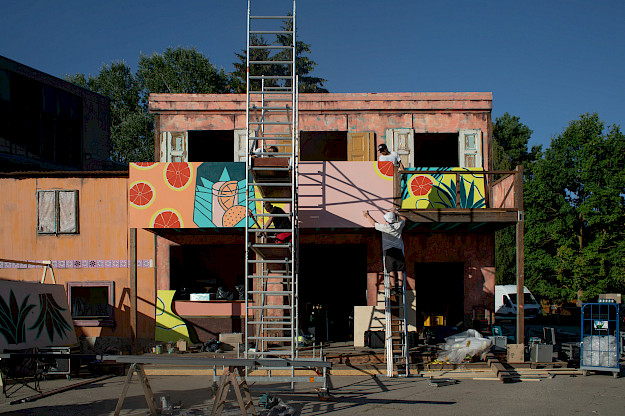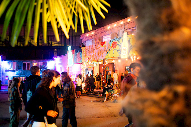 Unsere Lösung: große Platten mit knalligen Patterns der Kampagnen CI am Haus zu montieren. 100% Handarbeit und individuelle Lösungen und Ideen. Und dazu ein Lichtkonzept, das unser House of Paloma zum Shining Star und Hotspot des Festivals gemacht hat.