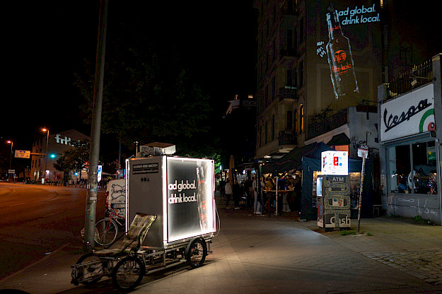 Außerdem haben wir mit Szeneplakatierung, einer interaktiven 18/1 Abreiss-Coupon-Aktion und unserem Buzz Bike Projektionen an prominente Wände im Viertel geworfen und die Botschaft "Act global. Drink local." verbreitet.