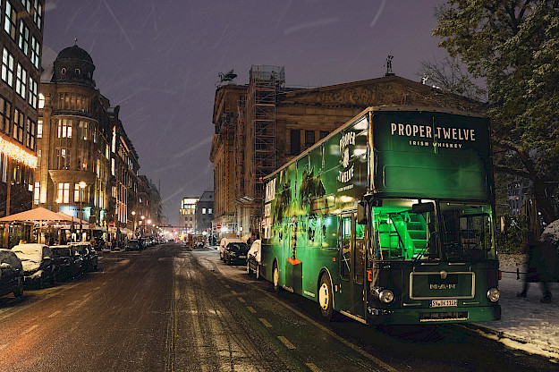 Für Proper Twelve haben wir mit unserer fahrenden XXL Litfaßsäule, dem Buzz Bus, im Sommer und Winter in Berlin und Frankfurt für mächtig Buzz gesorgt. Die Gäste wurden erst zu einer Top Location eingeladen und dann an eine Secret Location gebracht - und den Bus mitten in der Location geparkt. Hier haben wir eine Screening Experience aufgebaut mit leckerem Catering, chilligem Loungebereich und selbstgebauten Barelementen. Unser Bus wurde dabei zur Leinwand.